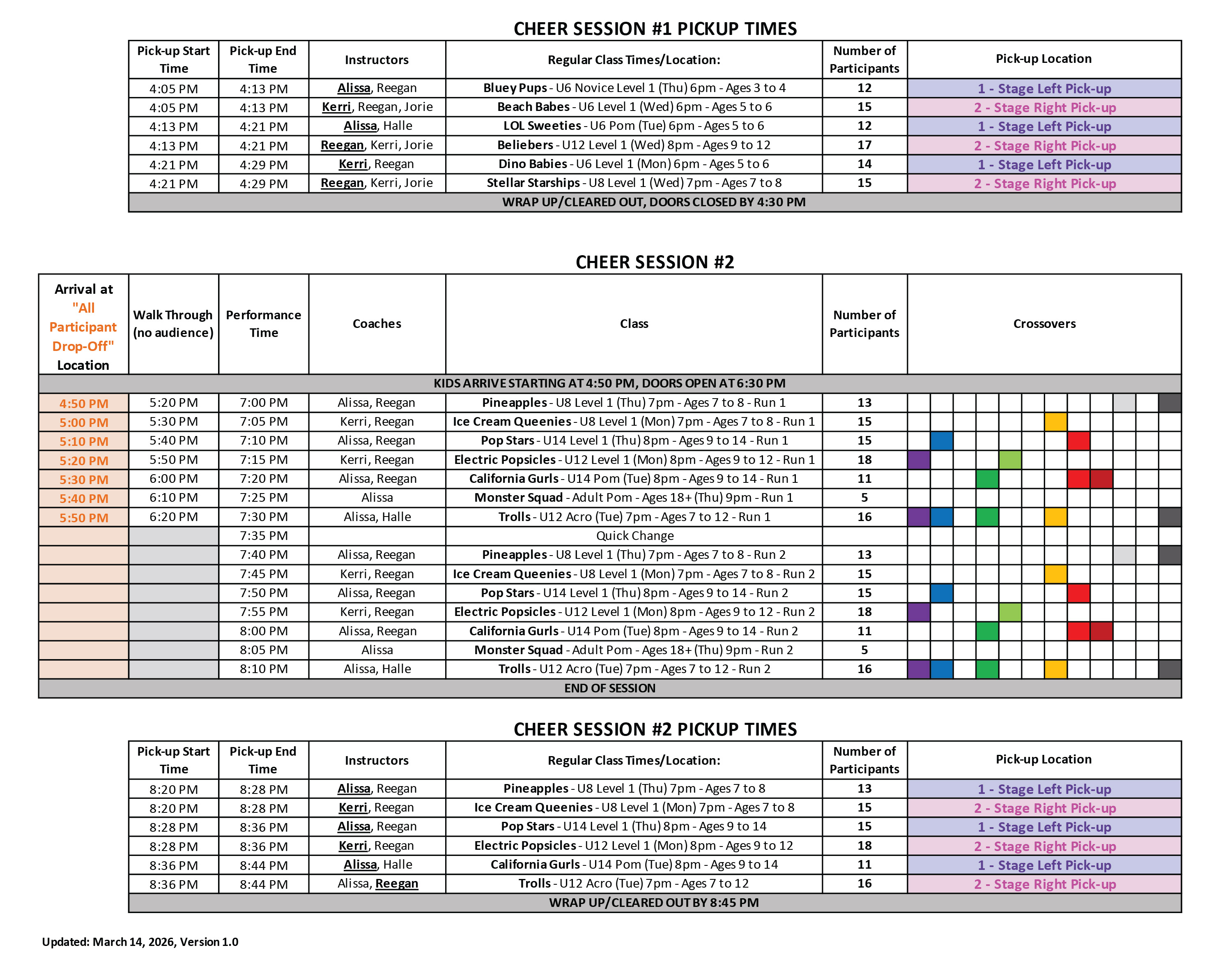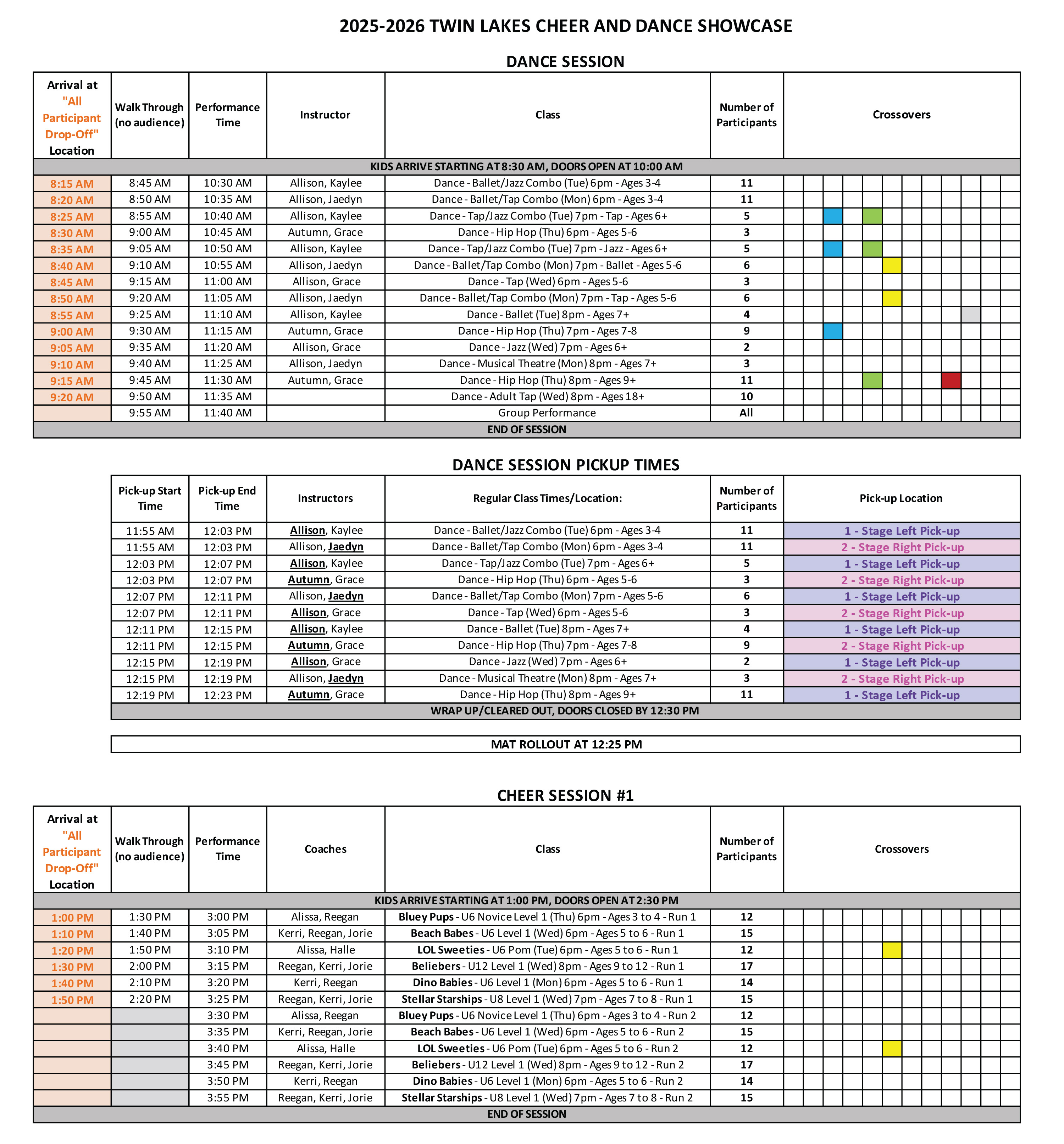 Thanks to your feedback, we’ve adjusted our approach to organizing the sessions. Instead of having classes remain backstage to perform across two sessions, each class will now participate in just one session and perform twice within that session. For families with children in two classes, most have been scheduled in Cheer Session 2 to help reduce the overall time commitment for the day.